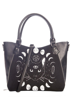 The black tote bag has occult symbols, cat, moon and pentacle design, double hand strap, back zip pocket, inner compartments and it fastens with a zipper at the top.