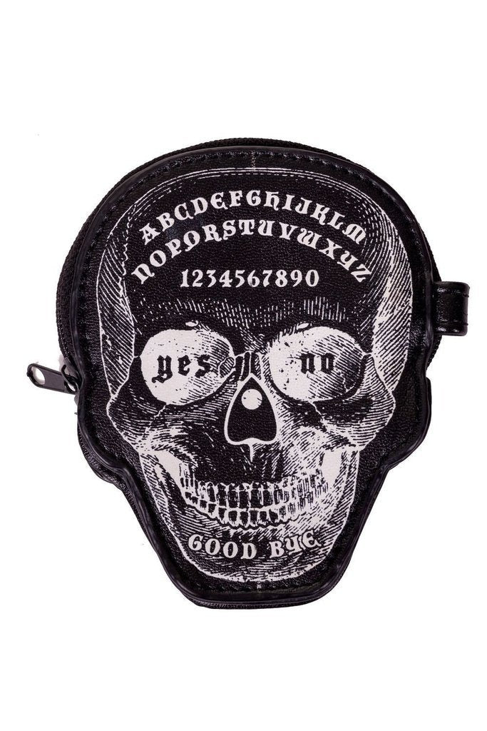 Show off how much you care about your outfits with this "Power Trip" purse from Banned. Made from 100% pu with a large skull and ouija board on the front and a zip on the top of the skull's head.
