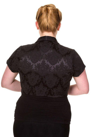 Be true to your darker self with this "Off The Night Bolero" from Banned. Made from 55% cotton, 42% polyester and 3% elastane with a fold over collar, short sleeves and a cropped design. Bring some gothic back to the modern day.