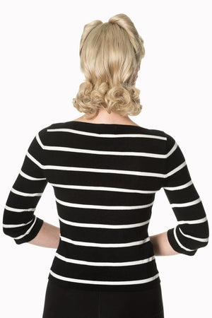 An irresistible, ladies, rockabilly, short sleeve sweater top designed by Banned Apparel, the "stripes please! knit jumper", with half length sleeves and available in a choice of black, blue, bordeaux or green with white stripes colours.