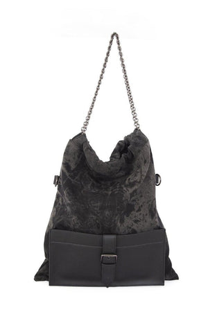 The dark foldable canvas bag has Caligo themed design, chain strap, adjustable shoulder strap, inner compartments, back zip and buckle closure.