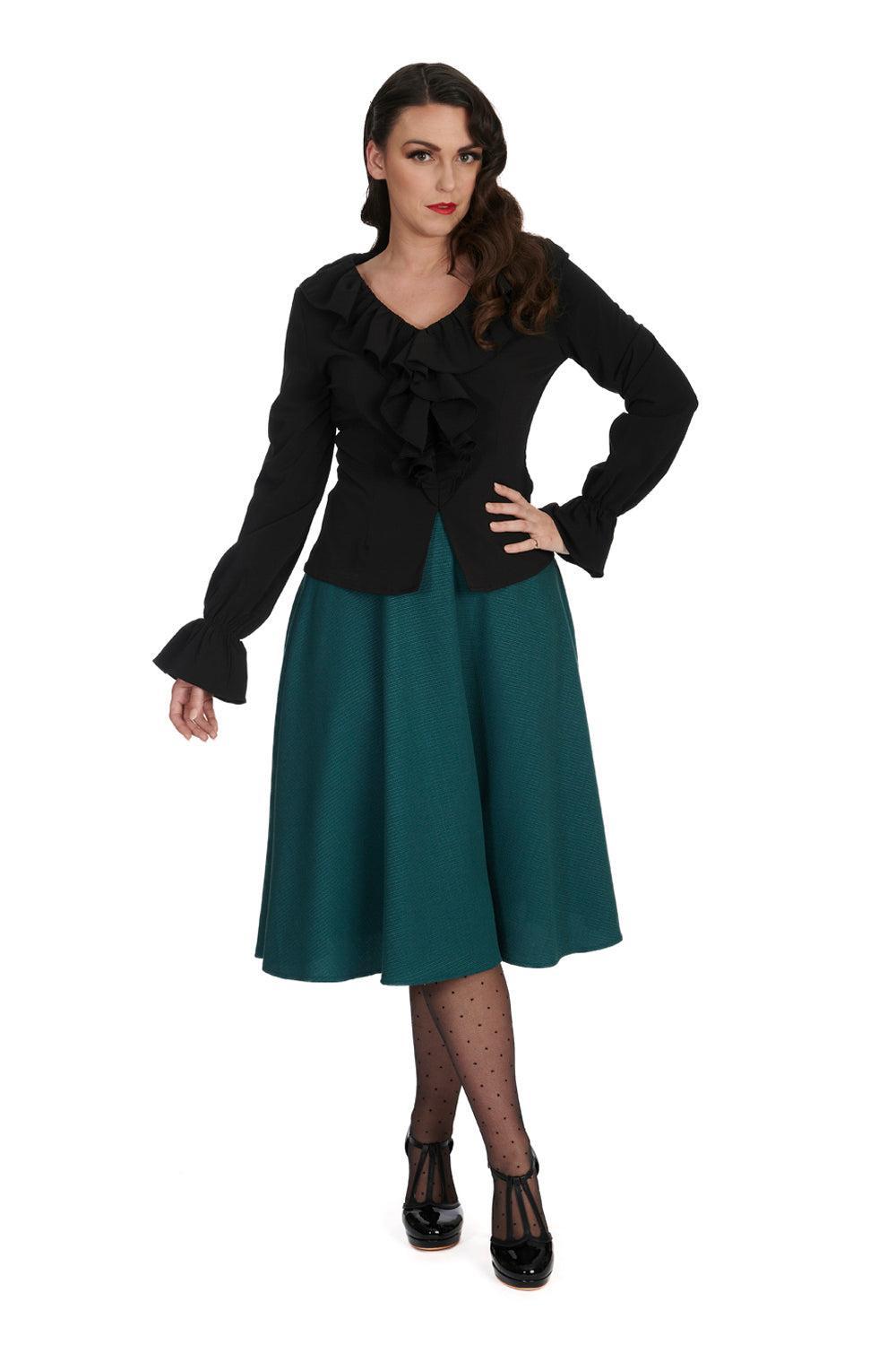 Become a retro royalty by wearing our Feeling Frilly from Banned Apparel. This flirty yet sophisticated design is inspired by rockabilly fashion, making it a true statement piece. Elevate your style and captivate the crowd with this luxurious and exclusive blouse.
