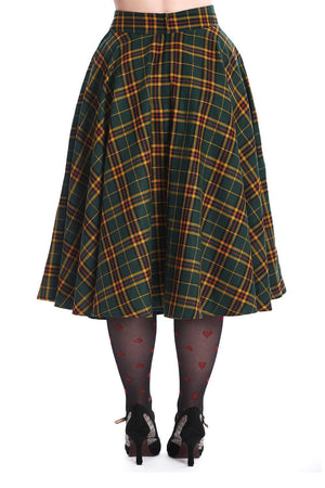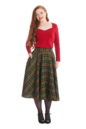 Elevate your retro style with our Highland Green Swing Skirt by Banned Apparel! This lovely plaid print skirt features side pockets and a back zip closure, making it both fashionable and functional. Perfect for a 50s inspired look.