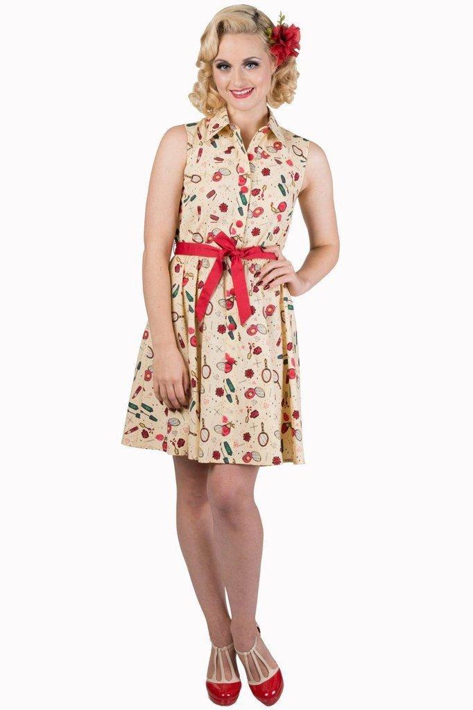 The mini dress has makeup accessories themed print, V-neckline, red contrast belt detailing, front button closure and a figure accentuating shape.