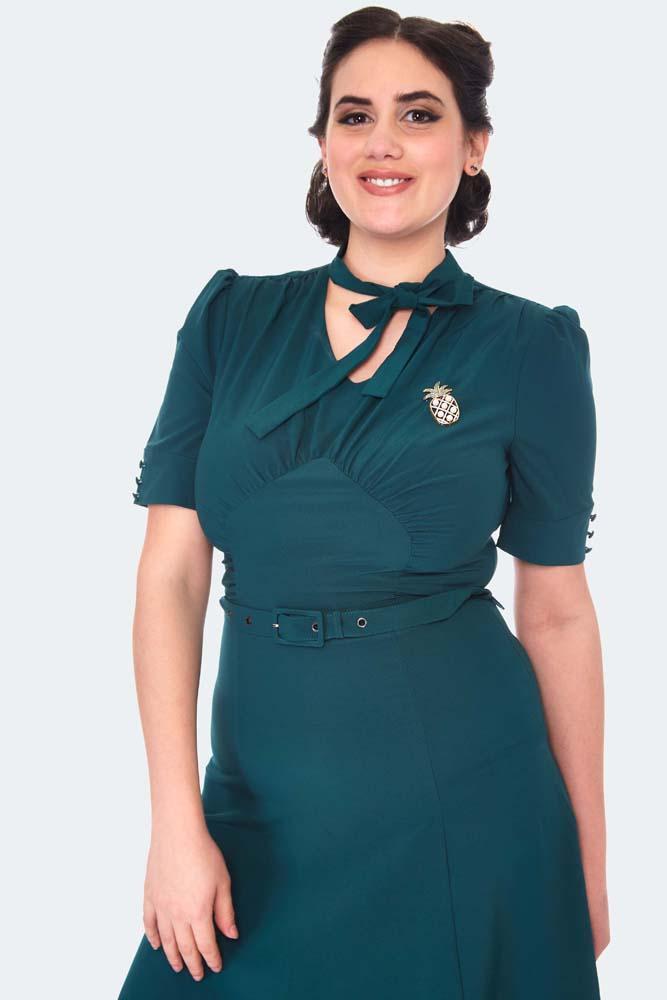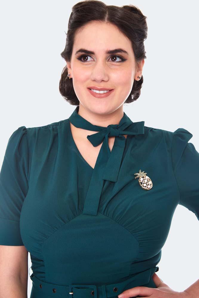 Add a playful touch to your outfit with this stupendous Pineapple Retro Style Brooch from Voodoo Vixen. Featuring a vintage-inspired heart-shaped C-clasp pin, it’s lightweight and easy to wear. Perfect for fruit lovers, this charming accessory pairs beautifully with the Gloria Fruit Print Dress to create a fun, fruity ensemble that’s sure to turn heads. Embrace your sweet side and wear your style with a splash of retro flair.