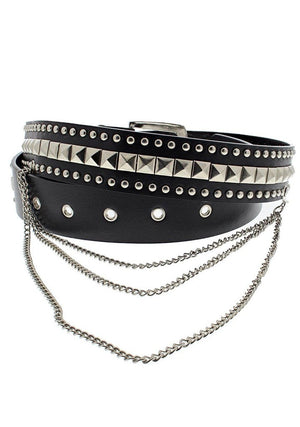 The black vegan leather belt has silver pyramid studs, silver conical studs and silver hanging chain detailing.