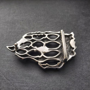 An awesome skeletal hand belt buckle with a skull detail on the middle finger. The buckle is heavy and solid, made in stainless steel.