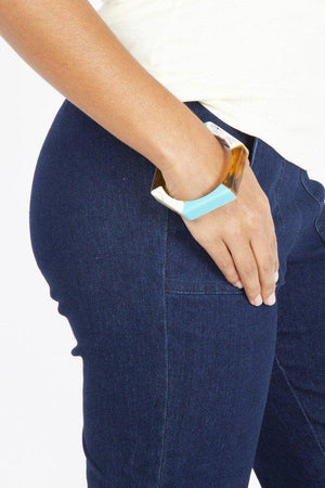 This bracelet has acrylic resin, faux marble and turquoise blocks and a hexagon shape.