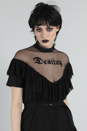 The t-shirt dress has an intimidating 'Destiny' print, short sleeves, frill detail, a high neckline and a flattering fit.