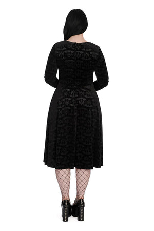 Unleash your dark side with the Velvet Bat Fit & Flare Dress from Banned Apparel. This gothic-inspired dress features a 1950's silhouette, full length sleeves, and a stretch fabric for comfortable wear. The velvet flock bat print adds a touch of edge while the zip opening at the back makes for easy wear.