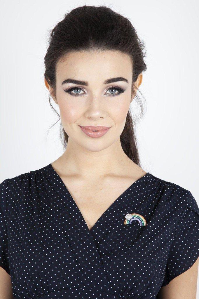 This lightweight brooch has jewel encrusted flower and rainbow detailing and metal frame.