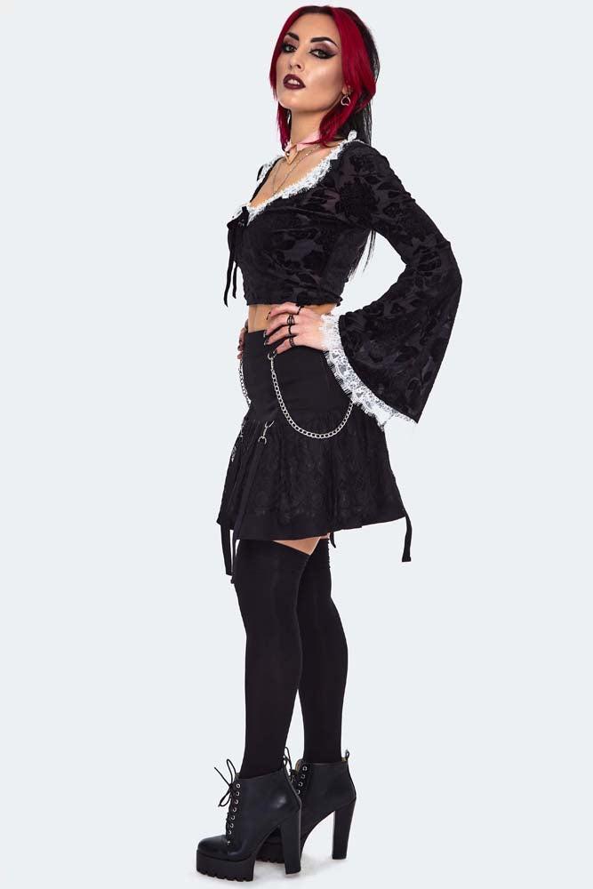 • The Lace Frill Mini Skirt by Jawbreaker delivers a stupendous gothic edge with its twill A-line silhouette and delicate lace frill. Designed to impress, it features detachable grosgrain straps at the front and back that transform the look into a daring garter style, complemented by striking silver chains. This mini skirt combines bold details with feminine flair, making it an unforgettable addition to any dark fashion wardrobe.