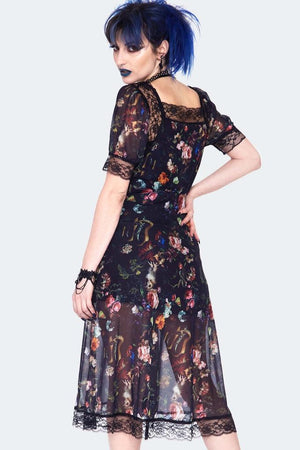 The mini dress has night garden themed design, mesh and lace trim detailing, short sleeves and a flattering fit.