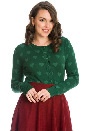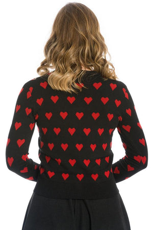 The vintage cardigan has allover hearts print, crew neckline, ribbed hem and cuffs, full length sleeves and it fastens at the front with glossy buttons.