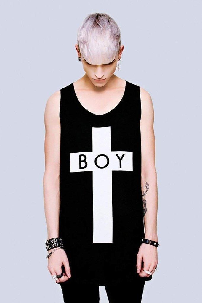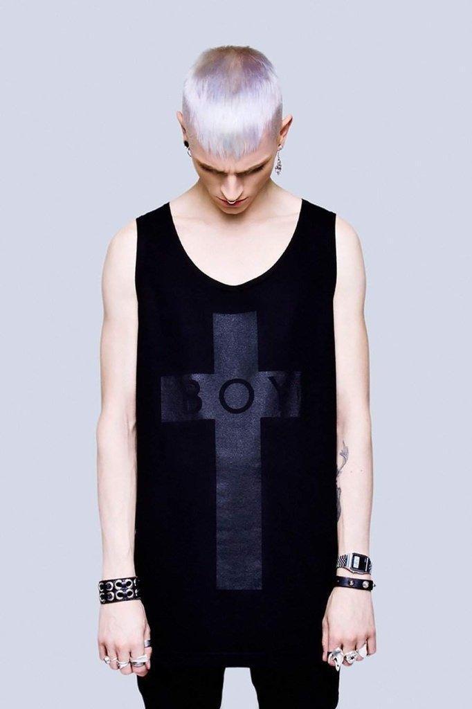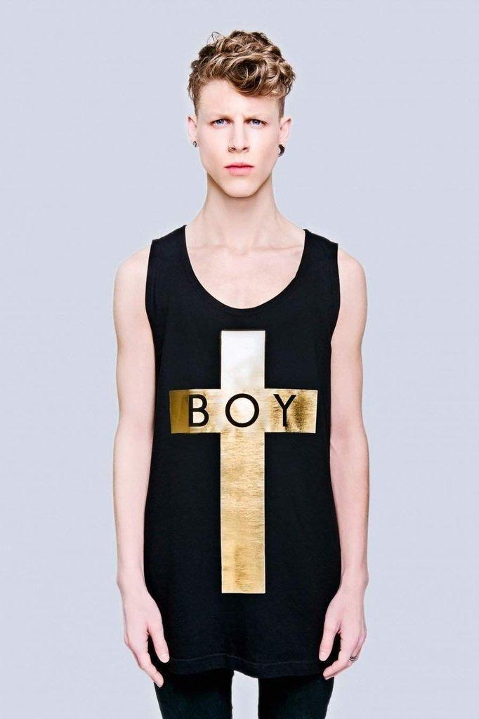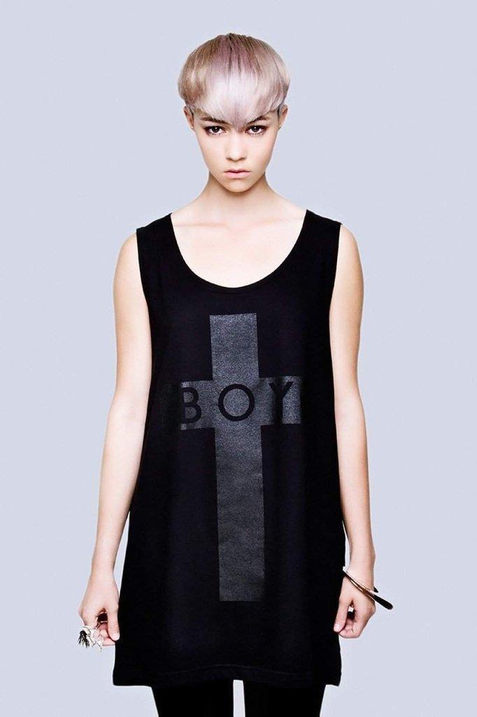 A superb black, unisex gothic vest top from Long Clothing, with a cross print and the word "Boy" on top. The print is available in a choice of four colours, white, black, gold or silver.