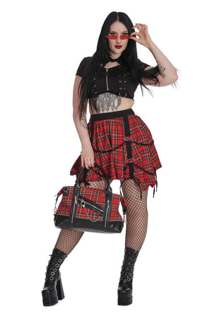 Revamp your gothic babe wardrobe with the Red Diy Disturbance Mini Skirt from Banned Apparel. Featuring bold red tartan print, chain d-ring and suspenders detailing, and a back zip closure, this mini skirt is perfect for making a strong statement. Show off your edgy style with this unique piece.