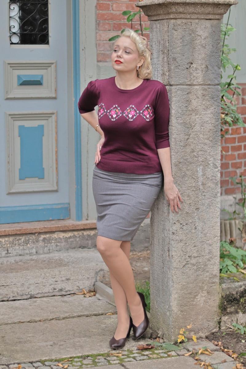 • Indulge in the splendid charm of our Purple Floral Embroidered Sweater, a rockabilly treasure from Voodoo Vixen! This 40s-inspired masterpiece showcases exquisite vintage floral diamond embroidery against a rich purple backdrop. Elegantly designed with a flattering round neck, delicately gathered shoulders, and sophisticated half sleeves—perfect for adding a touch of retro glamour to your wardrobe.