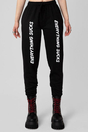 The black joggers have front "Everything Sucks" print, front ribbon tie, side pockets and a flattering fit.