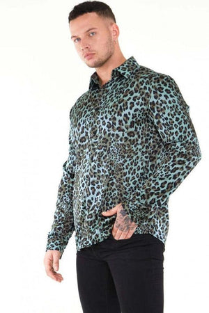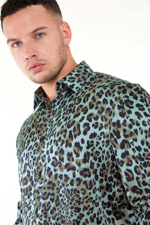 The shirt has leopard animal print, a high neckline, button down closure, a regular fit and long sleeves.