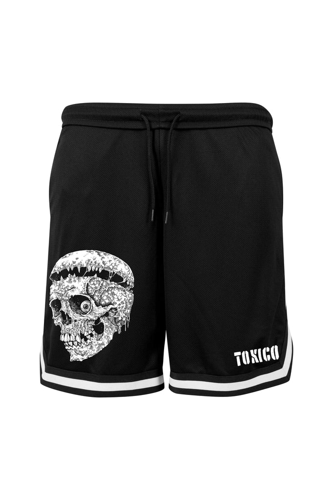 These men sports shorts have two tone stripe design, skull and Toxico tattoo print, an elasticated waist and slit side pockets.