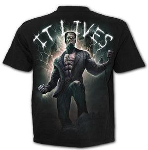 Summon the horror of IT Lives with this gothic black t-shirt from Spiral Clothing. The electrifying design showcases a macabre scene of resurrected corpses and lightning bolts, perfect for those who love the thrill of horror. Don't miss out on the 50,000 volts of terrifying style.