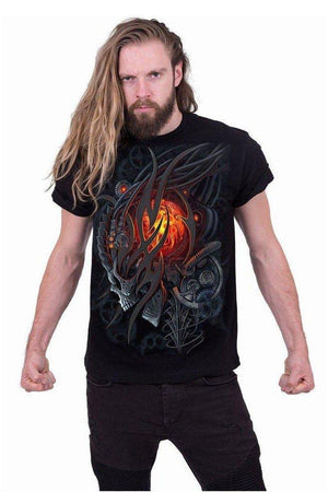 This black t-shirt is made from the highest quality, 100% cotton, fleece and the print uses skin friendly, azo-free, reactive dyes. Featuring flaming skull print, a high neckline and short sleeves.