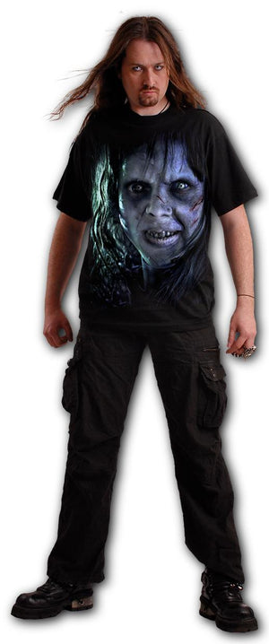 This gothic T-shirt from Spiral Clothing features the iconic image of Regan's possession from the classic film, The Excorcist. Made with high-quality materials and officially licensed by Warner Bros, this shirt is a must-have for any fan. Own a piece of cinematic history with its eerie back print.