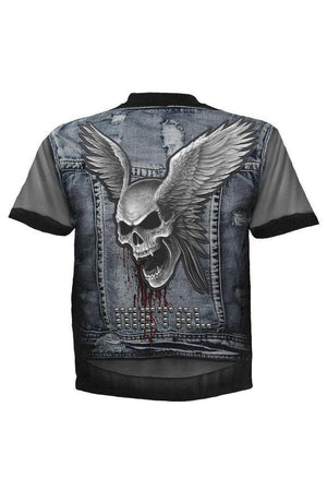 This t-shirt is made from the highest quality, jersey and the print uses skin friendly, azo-free, reactive dyes. Featuring thrash metal print, patches and studs detail, short sleeves and a high neckline.