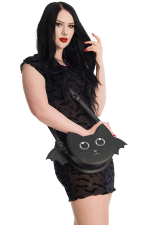 The gothic dress has bats detailing, a round neckline,a figure accentuating shape and short sleeves.