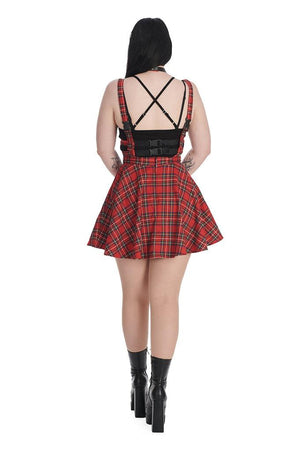 The flared skirt has tartan print, adjustable straps detailings, pockets and a figure accentuating shape.