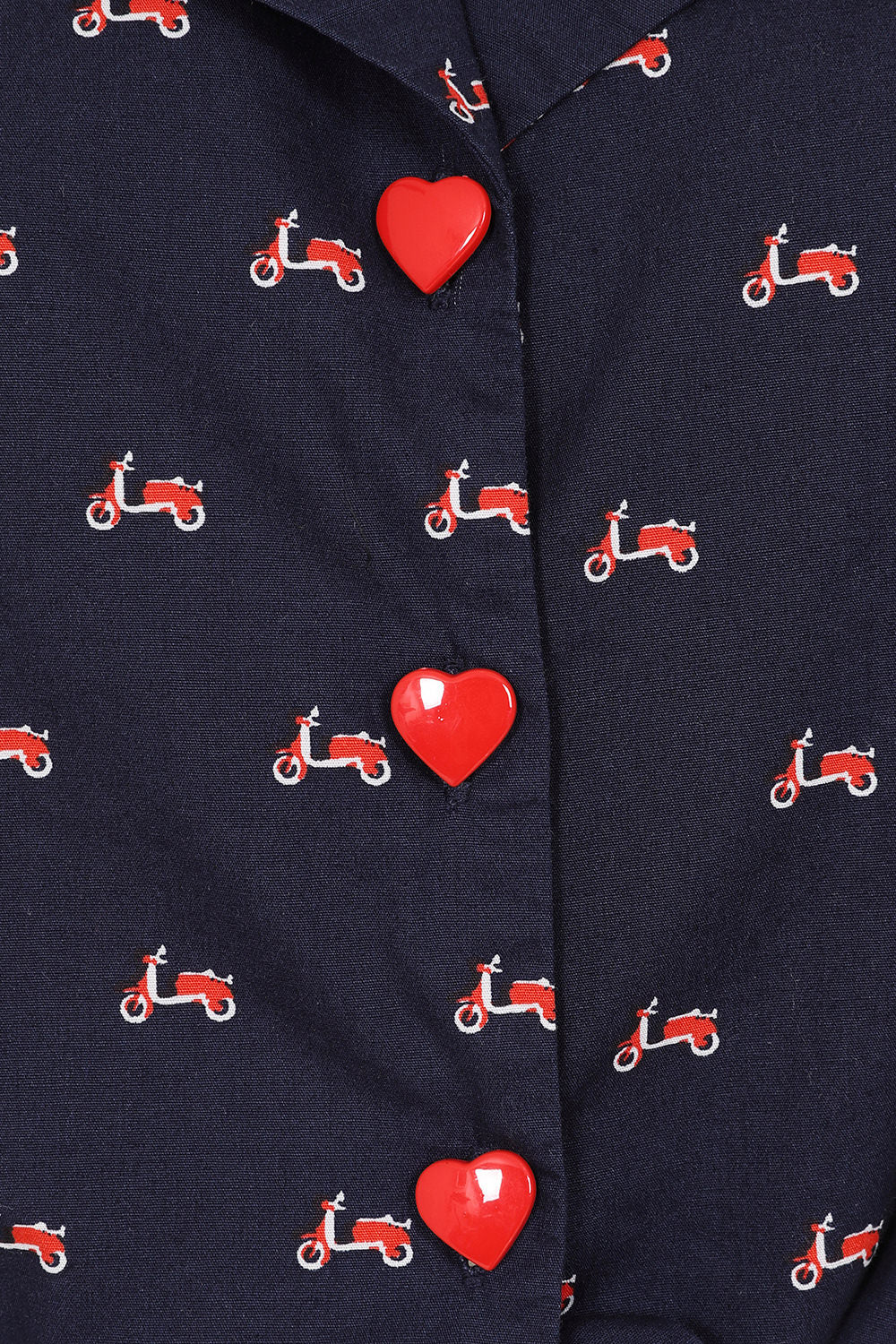 Absolutely stunning Navy Sandy Vespa Blouse by Banned Apparel that'll have you turning heads! This fabulous sleeveless retro number features an iconic Vespa print that screams vintage cool. Crafted from breathable cotton, it boasts a charming heart button detail and adjustable front tie closure for the perfect fit. Whether you're channelling 1950s elegance or adding a touch of retro flair to your wardrobe, this blouse is an absolute showstopper.