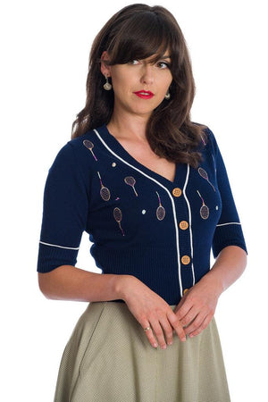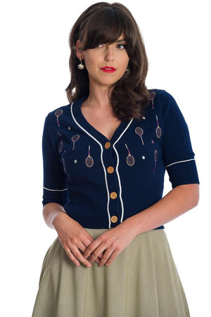 The retro cardigan has tennis embroidery, a V-neckline, ribbed hem and cuffs, half length sleeves and it fastens at the front with buttons.