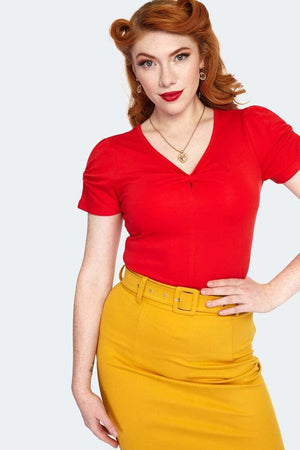 This Belted Pencil Skirt from Voodoo Vixen is an elegant choice for a classic 50s look. Featuring a stretch pencil skirt in a timeless mustard color with a matching waist belt, this skirt is sure to become a wardrobe staple. The style is available in mustard or navy color.