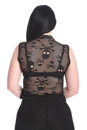 The Oh My Krazy Top from Banned Apparel embodies gothic fashion with its delicate mesh lace detailing and pentagram design. The front zip closure adds a touch of convenience to this edgy top. Elevate your style with this must-have piece.