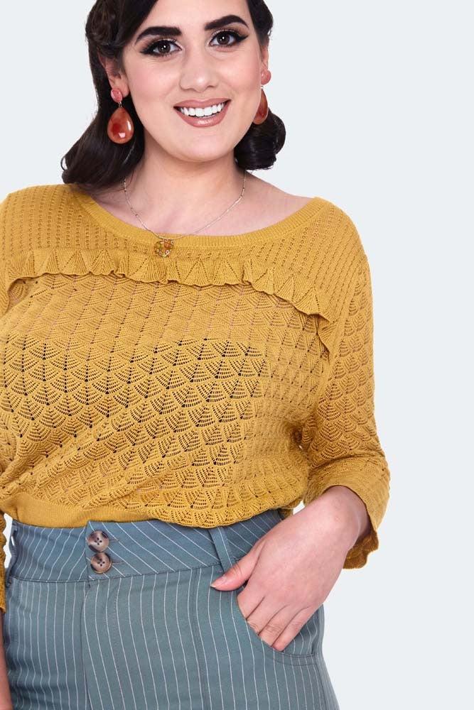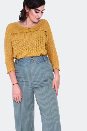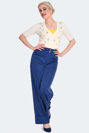 Introducing the Retro Pinstripe Style Turn Up Trousers, from Voodoo Vixen. This classic design features a high waist, wide leg cut, and a front fold and pocket. The timeless pinstripe pattern and turn-up cuffs give you a sharp, sophisticated look. Perfect for any formal event.