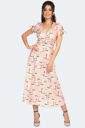Step onto the deck of your dreams in the Sail Away Print Midi Dress by Voodoo Vixen. Crafted from a vintage 40s style, this midi dress features short tie sleeves, a V neck, and button detail to create a timeless yet modern look. Its sail away boat prints guarantee to set you apart and elevate your look for any occasion.