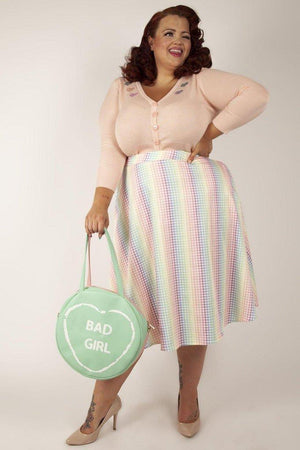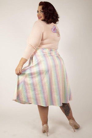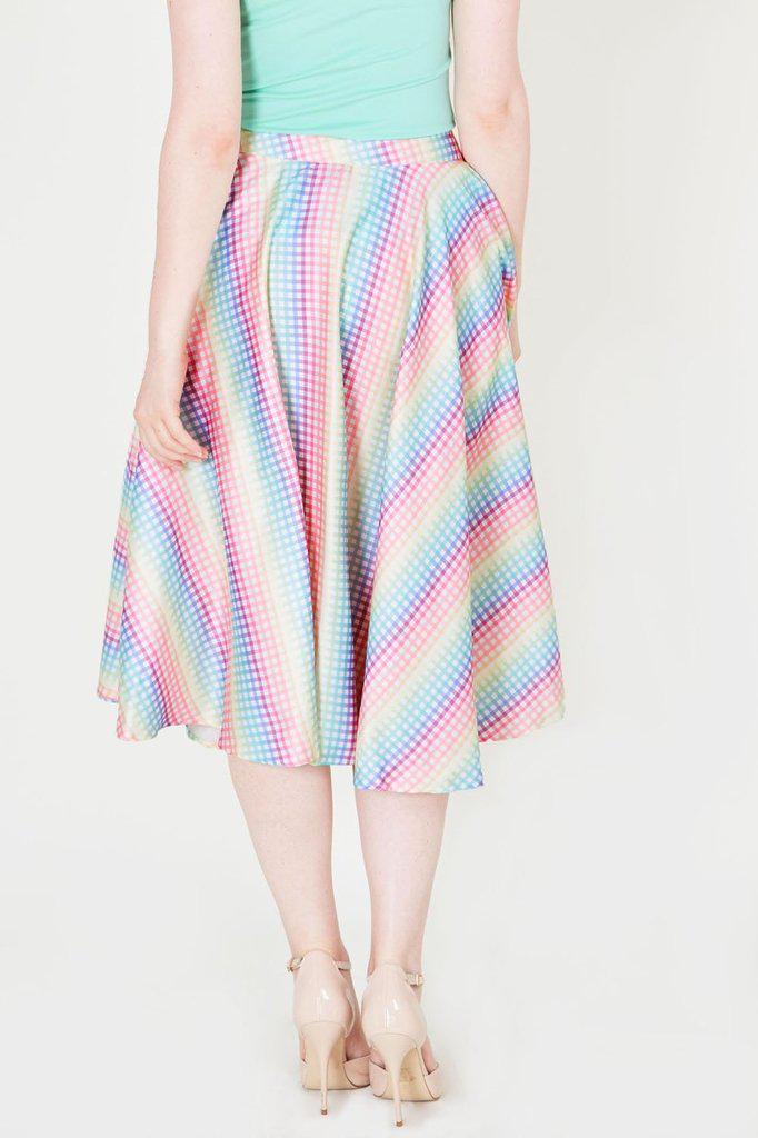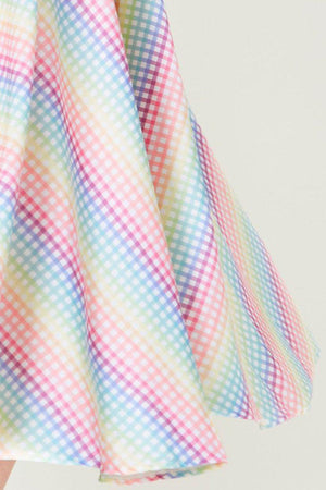 This full circle skirt has rainbow gingham print, pleats, pockets, elasticated ruching detailing, a flattering fit and side pockets.