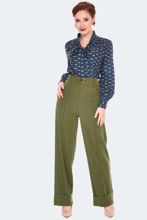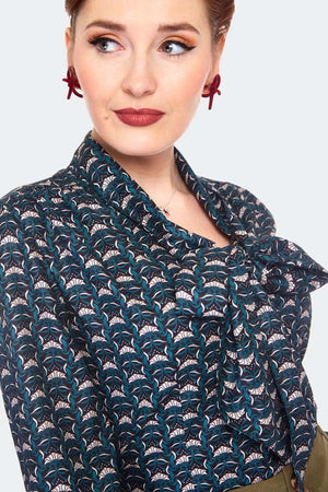 This Printed Long Sleeve Pussybow Blouse from Voodoo Vixen is the perfect blend of classic and modern style. Made with vintage inspiration and 20s style art deco patterned fabric, this blouse has a tie neck for an elegant and timeless look.