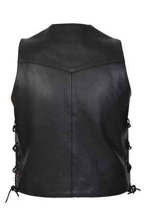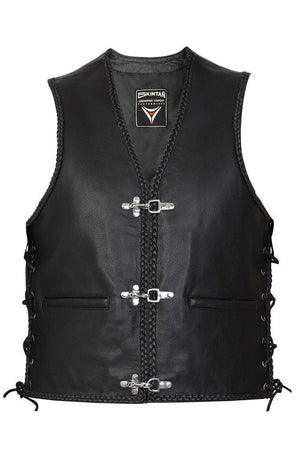 An epic braided leather waistcoat which has fish hook buckle fastenings and is made from highest quality black or brown real leather cowhide. The style also has appealing braided details and leather lacing at the sides to allow adjustment to fit perfectly. This style is ideal for men or ladies and can be customised with your own patches or badges, The front has two pockets and there is also one internal pocket.