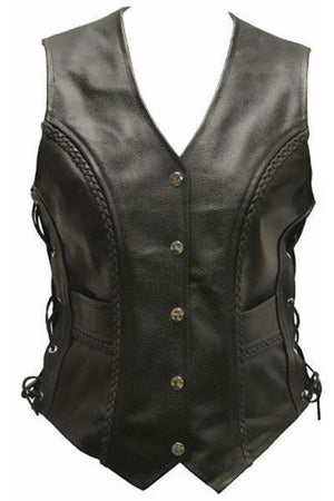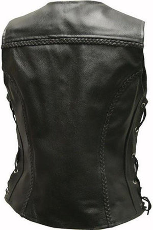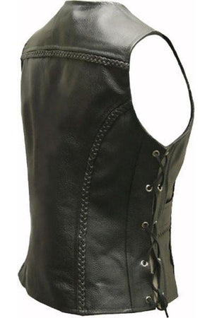 A superior ladies leather biker vest, made from top grade hide leather, and has attractive hand plaited braiding details on the front, under the pockets and also on the back and shoulders.