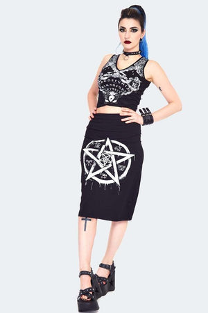For a daring, yet subtle statement-making style, look no further than the Pentagram Jersey Pencil Skirt from Jawbreaker. This knee-length skirt is crafted from comfortable stretch jersey and features an elasticated waistband and a large pentagram printed front panel for a unique touch. Enjoy a fashionable yet comfortable fit with this must-have item.