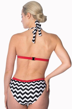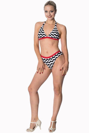 This is a strikingly exquisite, gothic, ladies swimwear by Banned Apparel, the "Black Coffee Two Piece Bikini". This style is available in black and red with a zig-zag pattern.