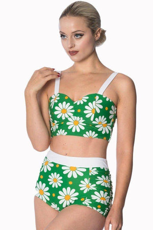 This is a mesmerizing and lovely, rockabilly, ladies swimwear by Banned Apparel, the "Crazy Daisy Halter Swimsuit". This style is available in green or red with an appealing floral print.