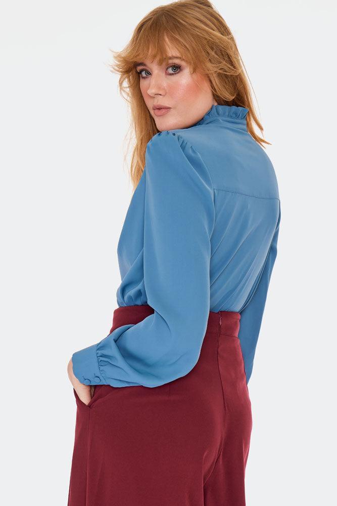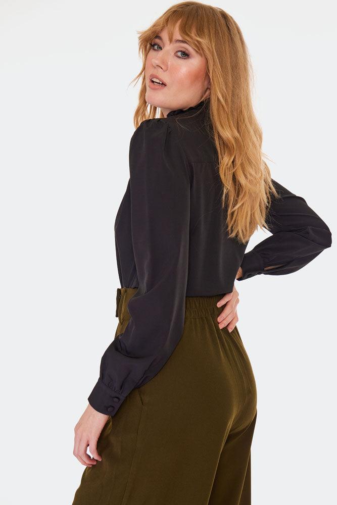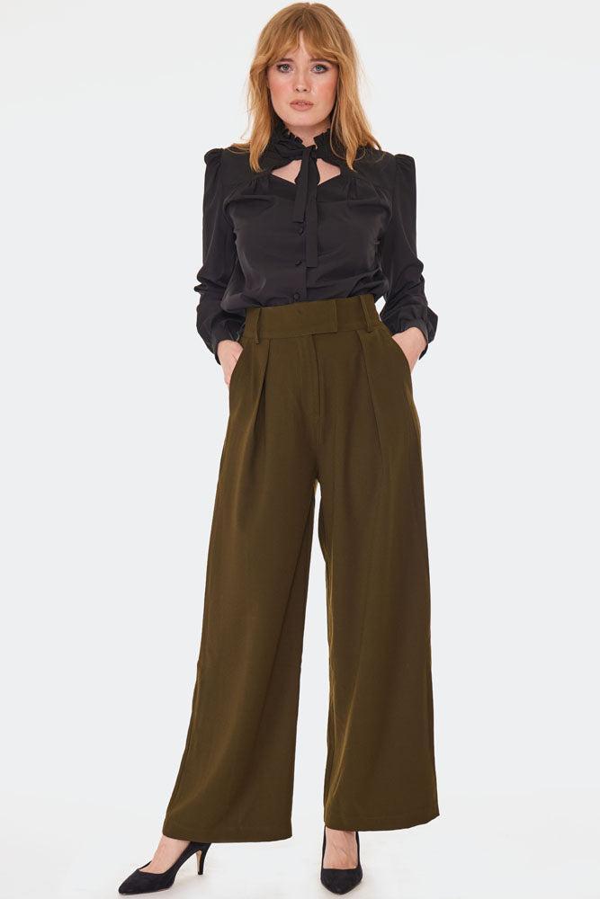 Channel timeless elegance with the 40s Tie Neck Blouse by Voodoo Vixen. This extraordinary vintage-inspired piece showcases a rich olive green hue and exquisite details—a feminine ruffle collar, graceful tie neck, and meticulously gathered shoulders. The long sleeves feature refined two-button openings, while five front buttons provide a classic closure. A remarkable wardrobe treasure that captures the sophisticated essence of 1940s fashion. The style is available in three chic colors.