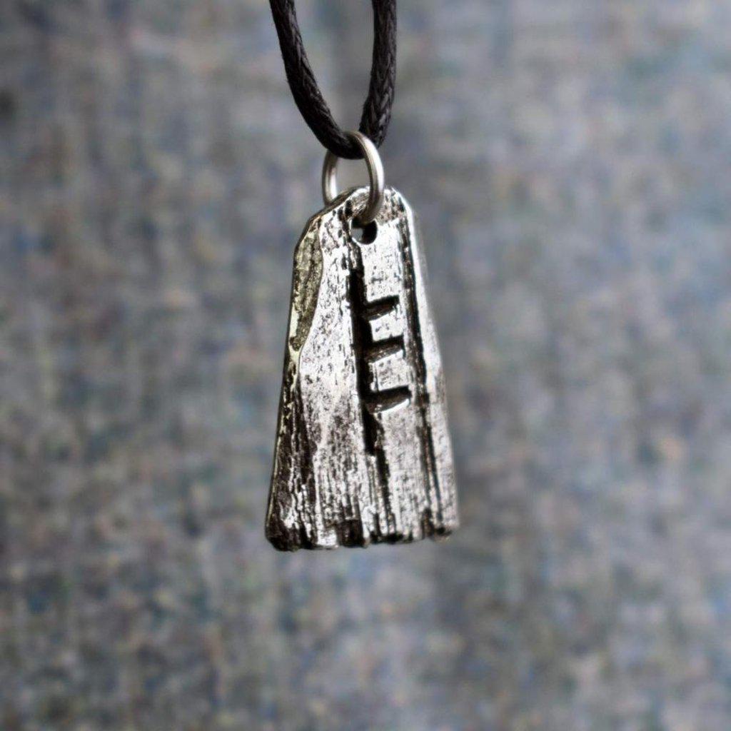 The pewter pendant has a Fern Ogham runic alphabet F or V and a black waxed string.
