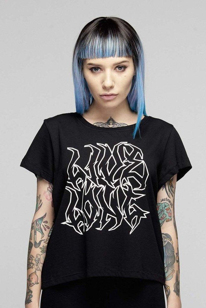 A legendary, black ladies cropped t-shirt from Long Clothing. This crop top has a striking white print at the front of the words "Live Long" in a heavy metal style font.