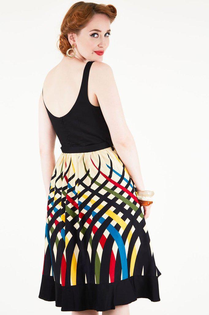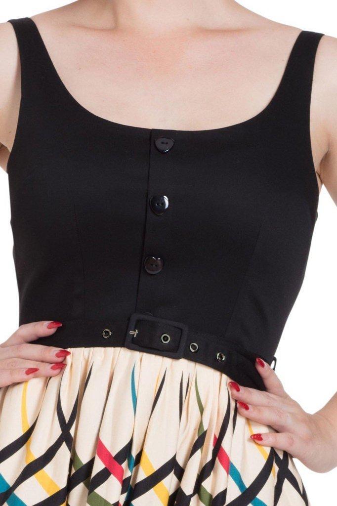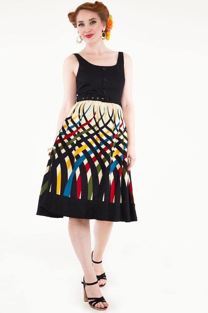 This sleeveless, two tone flared dress has multi-colored stripes, a wide scooped neckline, decorative buttons, an included fabric belt, black border, pockets at the side and it has a back hidden zipper.