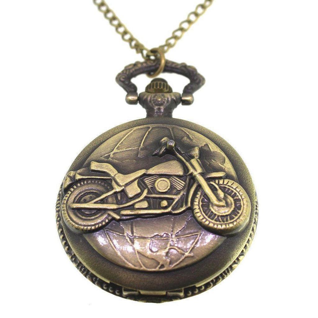 An excellent motorbike pocket watch, with an appealing design of a motorcycle over a globe. The watch is made in a zinc alloy which is free from nickel, lead and cadmium and also has a 31.5 inch necklace chain.