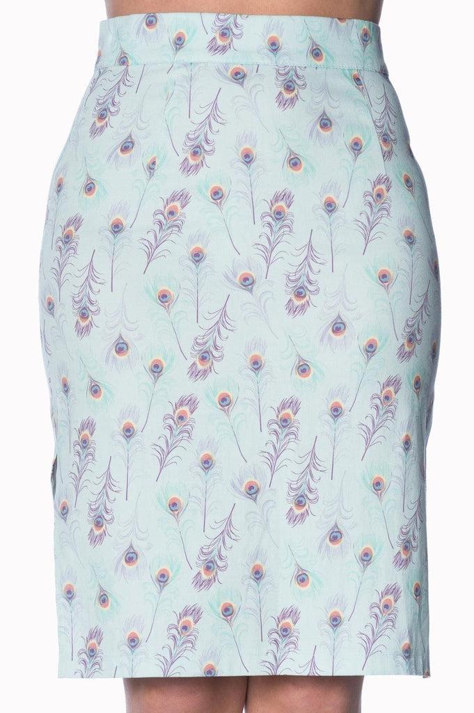 The pencil skirt has peacock design, a figure accentuating shape and it fastens at the back with a zipper.