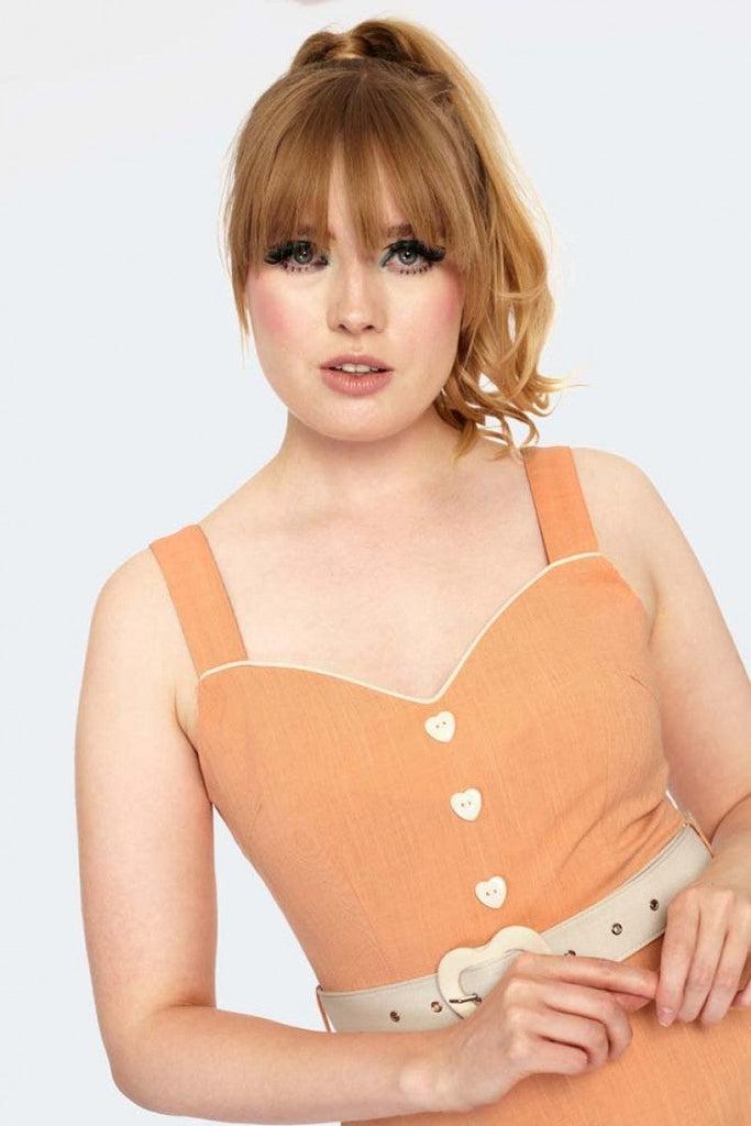 Look timelessly elegant in this Queen Heart Button Flare Dress, from Voodoo Vixen! Crafted from a 50s-style sleeveless silhouette featuring a sweetheart neckline, this dress stands out with its heart-shaped buttons and belt buckle. For the finishing touch, it comes with a heart-accented belt to define your waist. The style is available in orange or black color.